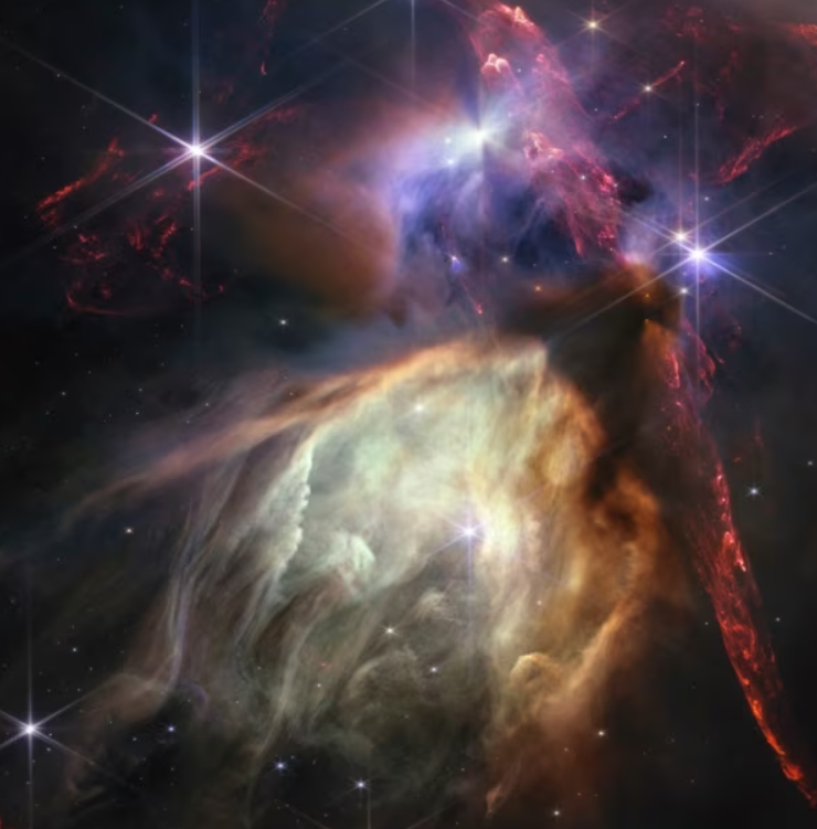 나사는 최근에 망원경으로 관찰한 새로운 이미지를 공개함으로써 웹의 1주년을 기념했습니다. 이 사진은 지구에서 약 390광년 떨어진 구름 속에 있는 50개의 아기 별들을 보여줍니다. 1광년은 9조 7천억 킬로미터입니다.