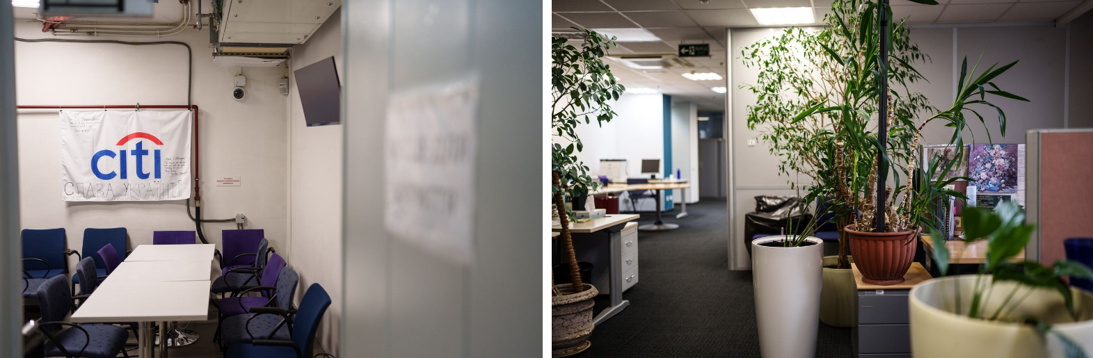 직원들은 교대로 키예프를 오가며 근무합니다. 공습 사이렌이 울리면 직원들은 본사 지하에 있는 은행 금고에 몸을 웅크립니다. 은행은 금고의 내용물을 치우고 책상과 테이블, 빈백 의자 등 좀 더 편안한 좌석으로 옮겼습니다. 은행은 사무실 내 인원을 금고에 안전하게 숨을 수 있는 인원 수로 제한했습니다.