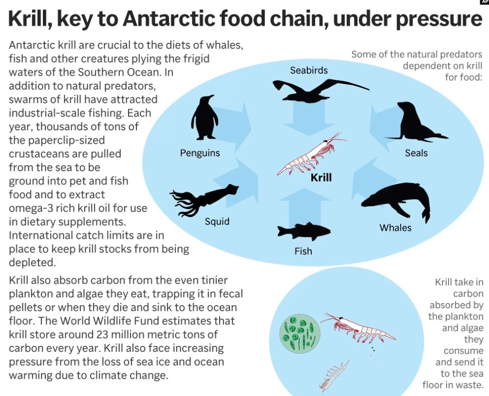 또한 스위스의 환경 보호 단체인 세계 야생 동물 기금에서 발표한 연구에 따르면 크릴이 대기에서 2300만 톤의 이산화탄소를 제거한다고 합니다. 이 연구에 따르면 크릴은 햇빛과 이산화탄소로 먹이를 만드는 미세한 형태의 생명체인 식물성 플랑크톤을 먹음으로써 이러한 역할을 수행한다고 합니다.