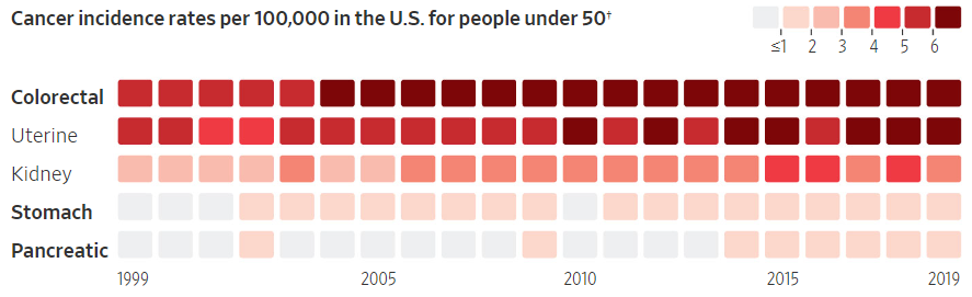 1950년대 이후 태어난 세대마다 어린 나이에 일부 암에 걸릴 위험이 증가했다는 연구 결과가 나왔습니다. 한 연구에 따르면 1990년대에 태어난 사람들은 1950년경에 태어난 사람들에 비해 조기 대장암에 걸릴 위험이 두 배, 직장암에 걸릴 위험이 네 배나 높다고 합니다.