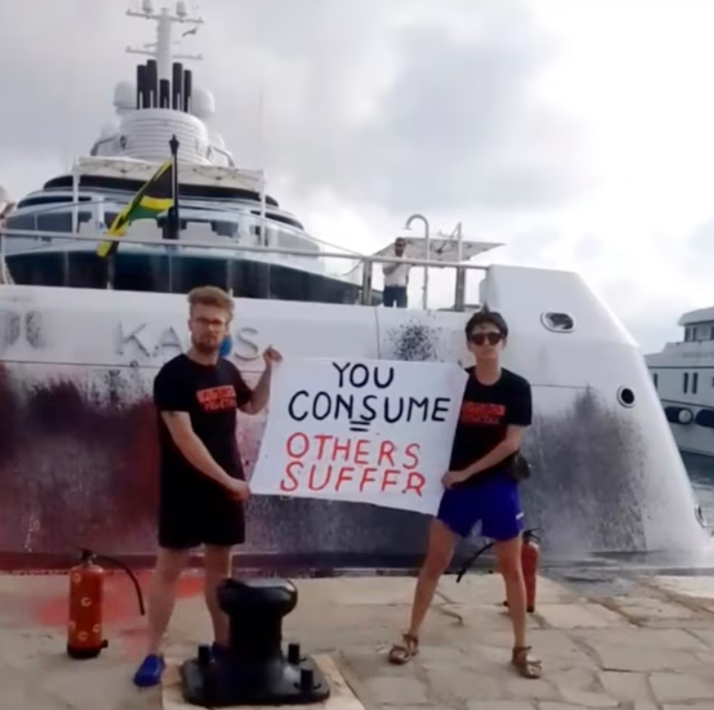 이러한 행동들은 활동가들이 말하기에, 대량의 탄소 오염을 대기로 방출하는 매우 부유한 사람들의 생활에 반대하는 캠페인의 일부입니다.