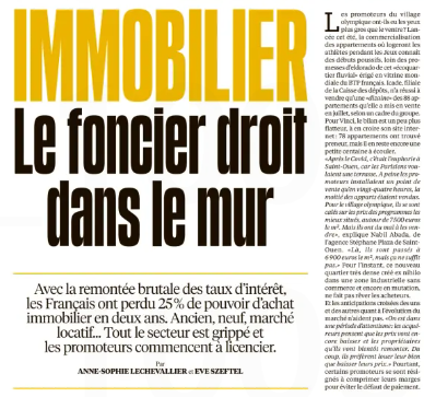 금리가 급격히 상승하면서 프랑스인들은 2년 만에 부동산 구매력의 25%를 잃었습니다. 부동산 업계 전체가 침체에 빠졌고 부동산 개발업체들은 직원을 해고하기 시작했습니다.