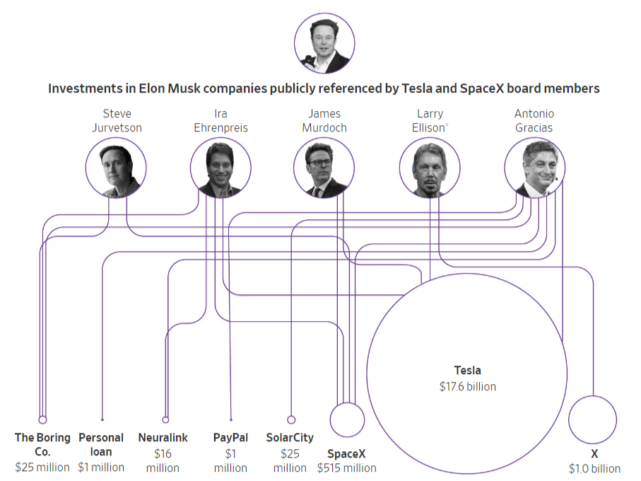 벤처 캐피털리스트인 그라시아스와 아이라 에렌프리스, 기술 거물인 래리 엘리슨, 전 미디어 경영자인 제임스 머독, 머스크의 동생 킴벌 머스크 등 머스크와 이들 이사들은 서로의 회사에 수천만 달러를 투자했으며 엘리슨은 2022년에 약 1.5%의 테슬라 주식 수십억 달러를 보유하게 됩니다. 또한 일부는 엘론 머스크의 경력 지원과 도움을 받기도 했습니다.
