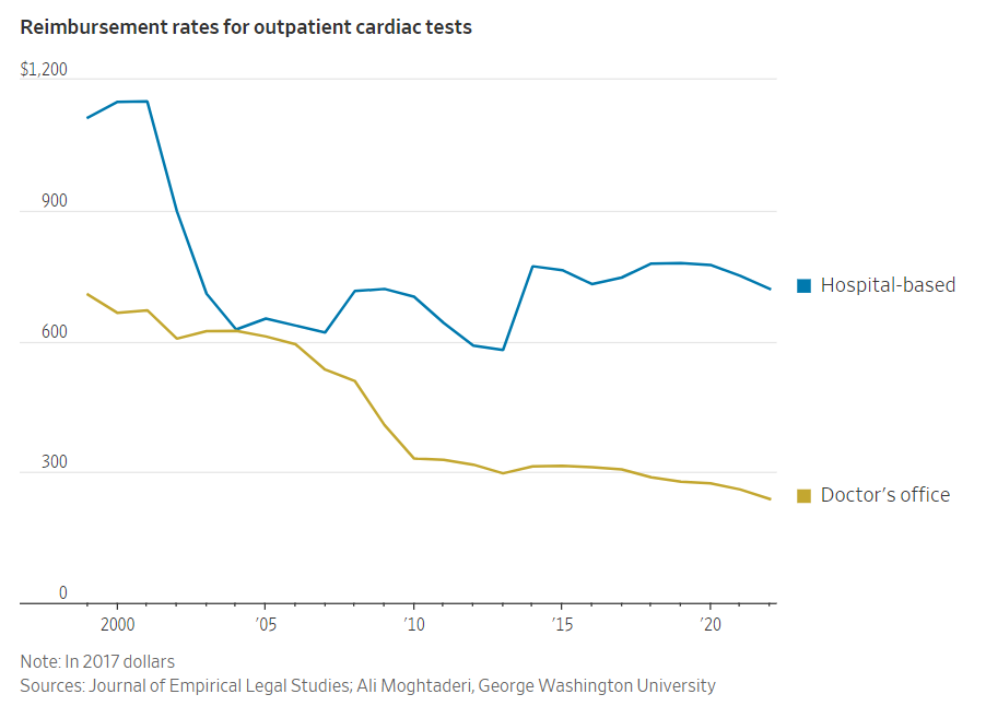 최근 몇 년 동안 병원들이 다른 곳에서 의료 서비스를 받을 수 있는 더 많은 옵션을 가진 환자들을 쫓아 인수합병에 나서면서 수수료는 더욱 만연해졌습니다. 현재 많은 병원 시스템은 입원하지 않은 환자로부터 수익의 절반 이상을 얻고 있습니다. 한 추산에 따르면 의사의 절반 이상이 병원에서 일하고 있습니다.