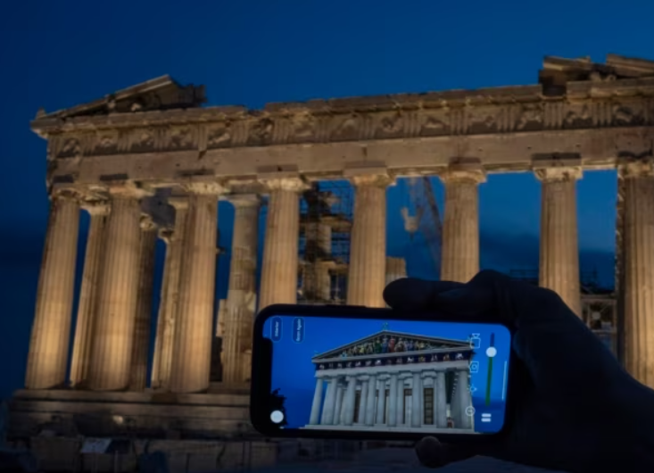 이 앱에서는 예를 들어 파르테논이 런던의 영국 박물관에 현재 있는 유명한 대리석 조각상을 가지고 있습니다. 이 앱은 방문객들이 파르테논 근처에 있던 곳에서 조각상을 볼 수 있게 합니다. 그리스는 영국에게 조각상을 반환하길 원합니다.