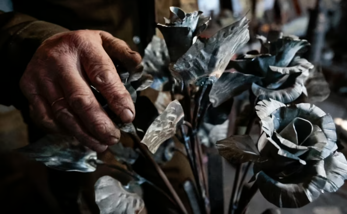 빅토르 미할레프는 금속으로 만들어진 것들을 만들고 수리하는 대장장이입니다. 그는 러시아가 통제하는 우크라이나 동부의 도네츠크에 살고 있습니다. 미할레프는 용접공으로서의 기술을 무기와 탄약의 금속을 꽃의 아름다운 표현으로 바꾸기 위해 사용합니다.