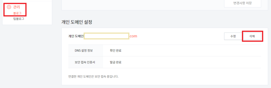 ⑦ 다시 오류가 나는 블로그로 돌아갑니다. [관리: 블로그]로 들어가서 기존에 설정되어 있던 개인 도메인 설정을 [삭제]해 주고 새롭게 만든 하위블로그의 도메인을 [연결]해 줍니다.