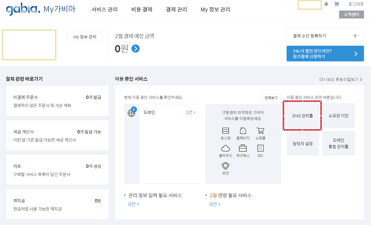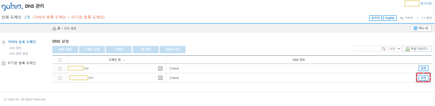 저의 경우 도메인 사이트 가비아에서 구입을 하였기 때문에 가비아를 예시로 보여드리겠습니다.