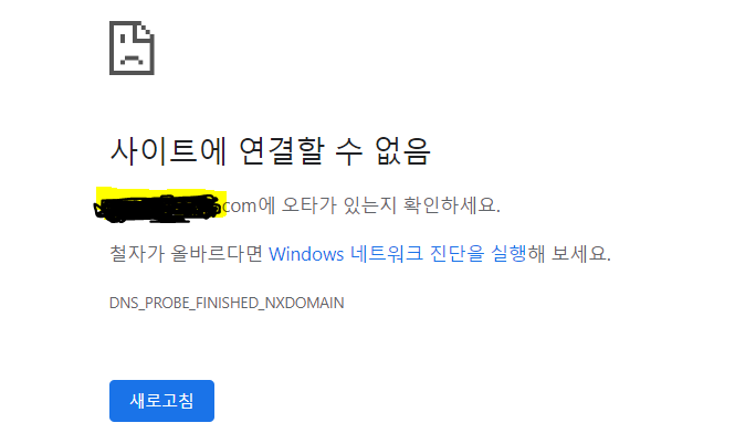 아마 특정 강의를 듣고 메인블로그 도메인을 레코드 수정으로 삭제한 뒤 새로 하위블로그 도메인을 만들어 하위블로그에 계정연결을 한 분들이라면 그후부터 갑자기 메인블로그에서 DNS_PROBE_FINISHED_NXDOMAIN 라는 오류가 나타날 것입니다.