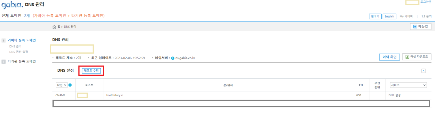 ④ DNS 설정에서 [레코드 수정]을 눌러줍니다.