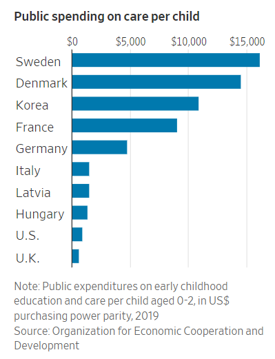 많은 선진국에서는 보육 문제를 대부분 근로자와 점점 더 많은 기업이 부담하는 미국과는 달리 보육 보조금을 지급하고 있습니다. 경제협력개발기구(OECD)에 따르면, 데이터를 이용할 수 있는 마지막 해인 2019년에 미국은 유아 1인당 900달러를 보육비로 지원했습니다. 이는 프랑스의 9,000달러, 스웨덴의 16,100달러와 비교됩니다.