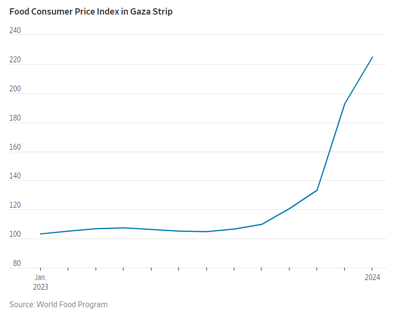 서안지구에 위치한 팔레스타인 중앙 통계국에 따르면 1월 가자지구의 식량 가격은 전쟁 전의 두 배가 넘었습니다. 세계식량계획에 따르면 소금과 밀가루 가격은 12월과 1월에 각각 전쟁 전의 10배 수준까지 올랐다가 공급이 시작되면서 하락한 반면, 쌀은 올해 들어 상승했다고 세계식량계획은 보고했습니다.