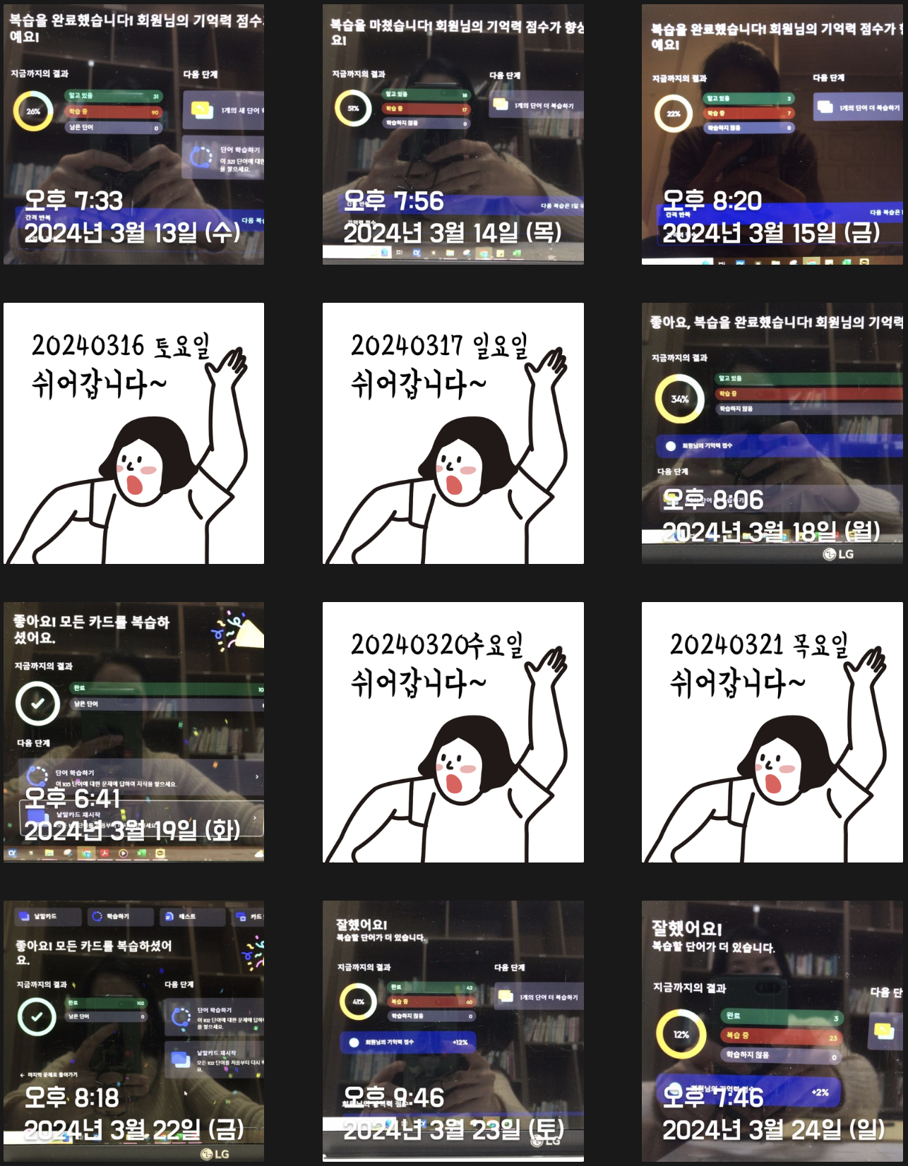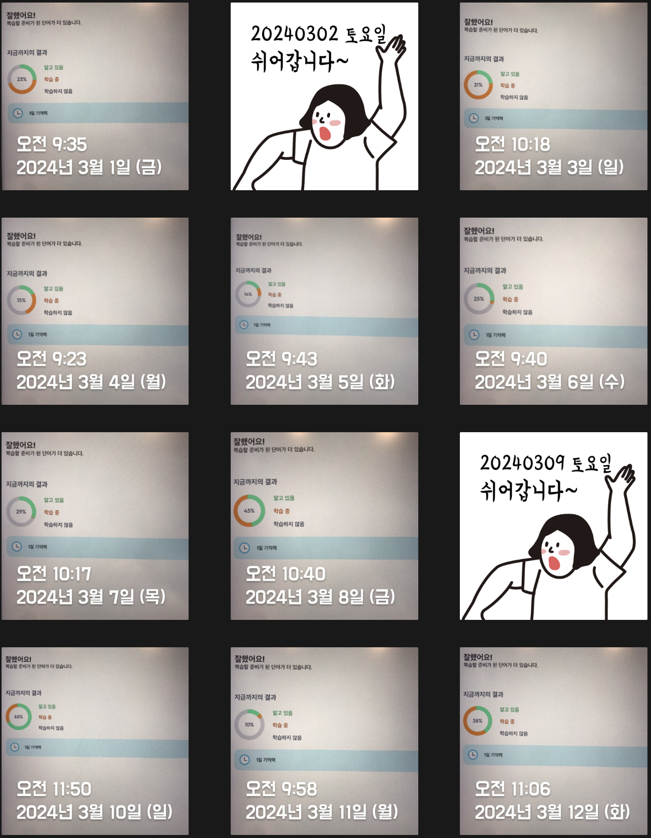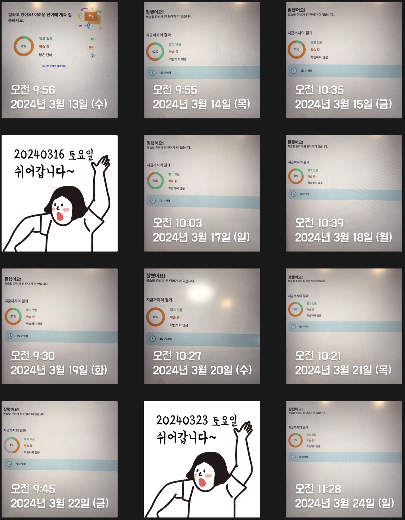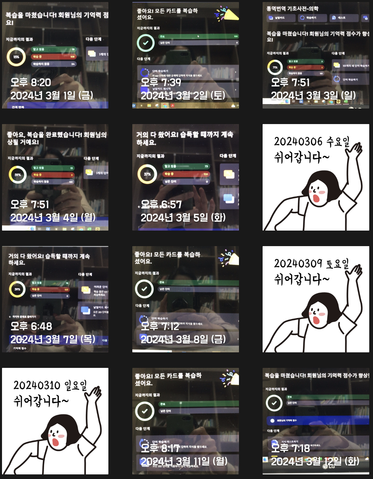 단어복습을 하루에 두 번 하자는 계획이 2월부터 스멀스멀 피어오르기 시작해 Trial을 거치던 시기라 2월은 절반밖에 성공하지 못했다. 하지만 3월엔 많이 나아졌다. 상반기까지는 이런 루틴을 계속 유지해야겠다(외워야 할게 느므 많거든 ㅜㅜ) 조금 아쉽긴 하지만 평일 저녁에 스터디가 있어 의무적으로 빠질 수밖에 없는 날들이 있다. 나의 J 성향에 "쉬어갑니다~"란 인증이 붙으면 너무 거슬리지만 그래도 최대한 정기적으로 루틴을 유지해보려고 노력해보겠다.