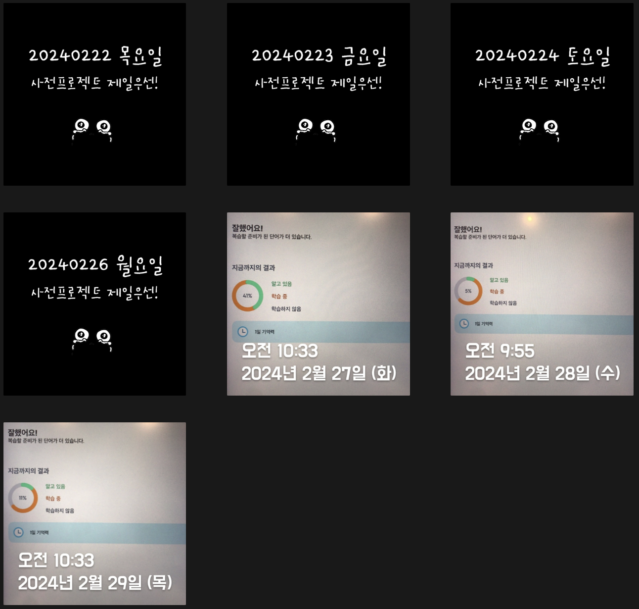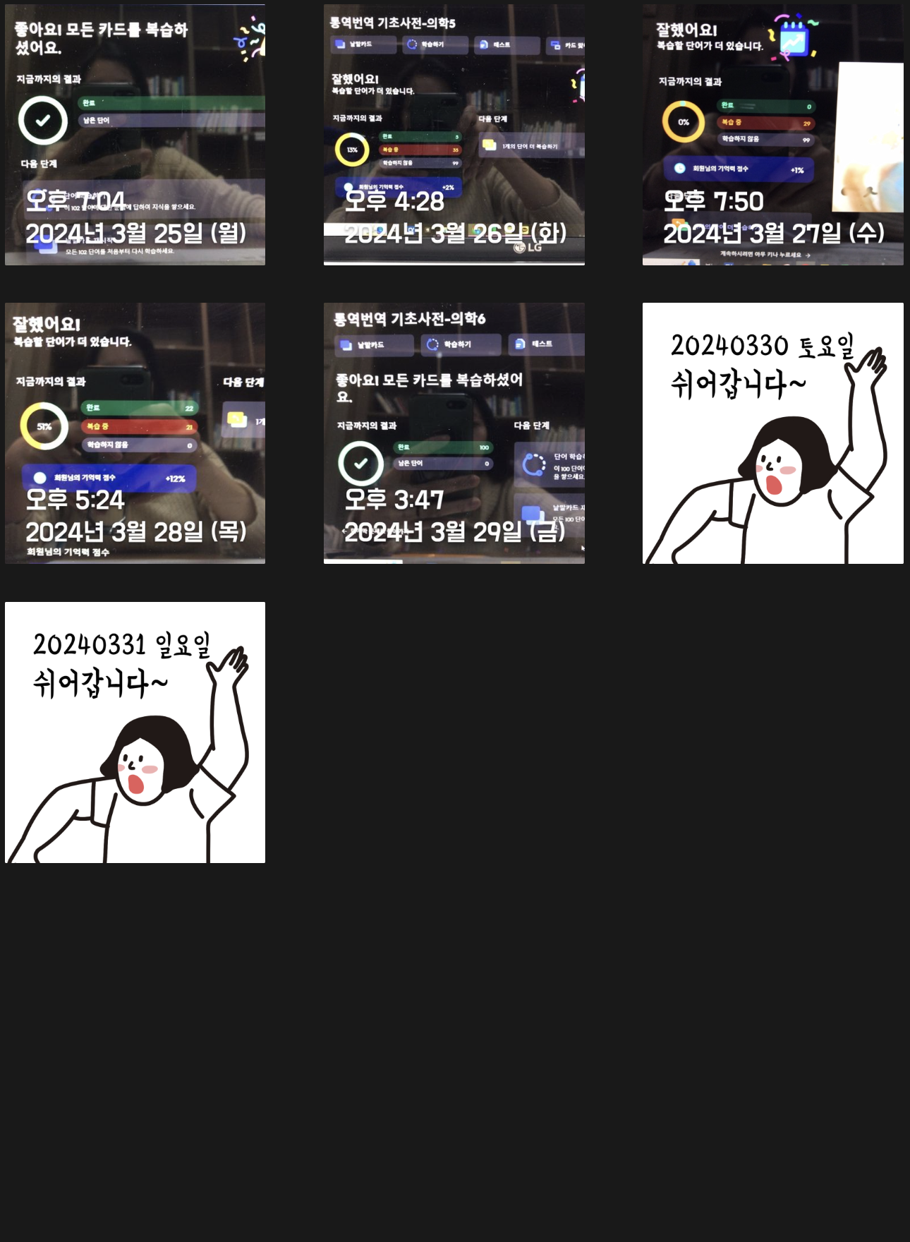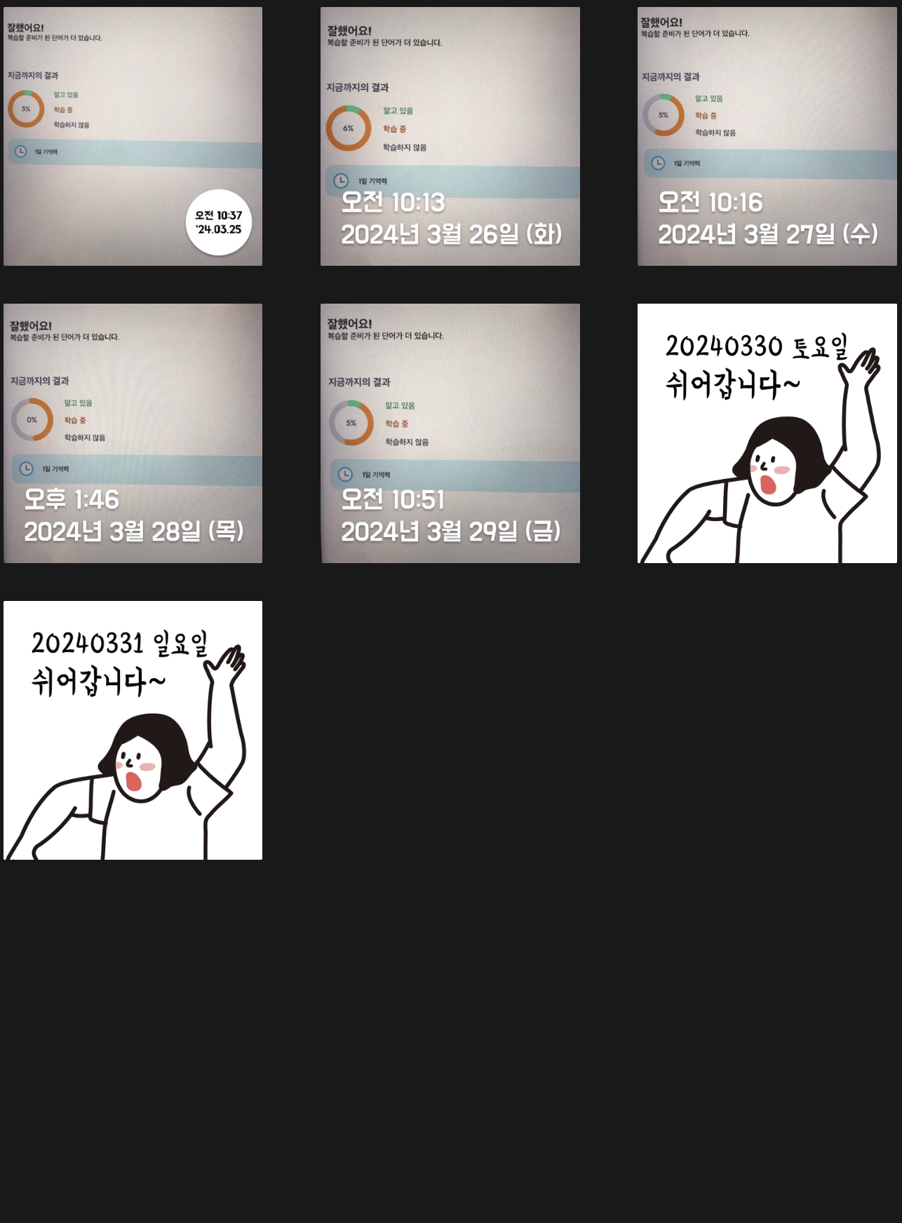 단어복습을 하루에 두 번 하자는 계획이 2월부터 스멀스멀 피어오르기 시작해 Trial을 거치던 시기라 2월은 절반밖에 성공하지 못했다. 하지만 3월엔 많이 나아졌다. 상반기까지는 이런 루틴을 계속 유지해야겠다(외워야 할게 느므 많거든 ㅜㅜ) 조금 아쉽긴 하지만 평일 저녁에 스터디가 있어 의무적으로 빠질 수밖에 없는 날들이 있다. 나의 J 성향에 "쉬어갑니다~"란 인증이 붙으면 너무 거슬리지만 그래도 최대한 정기적으로 루틴을 유지해보려고 노력해보겠다.