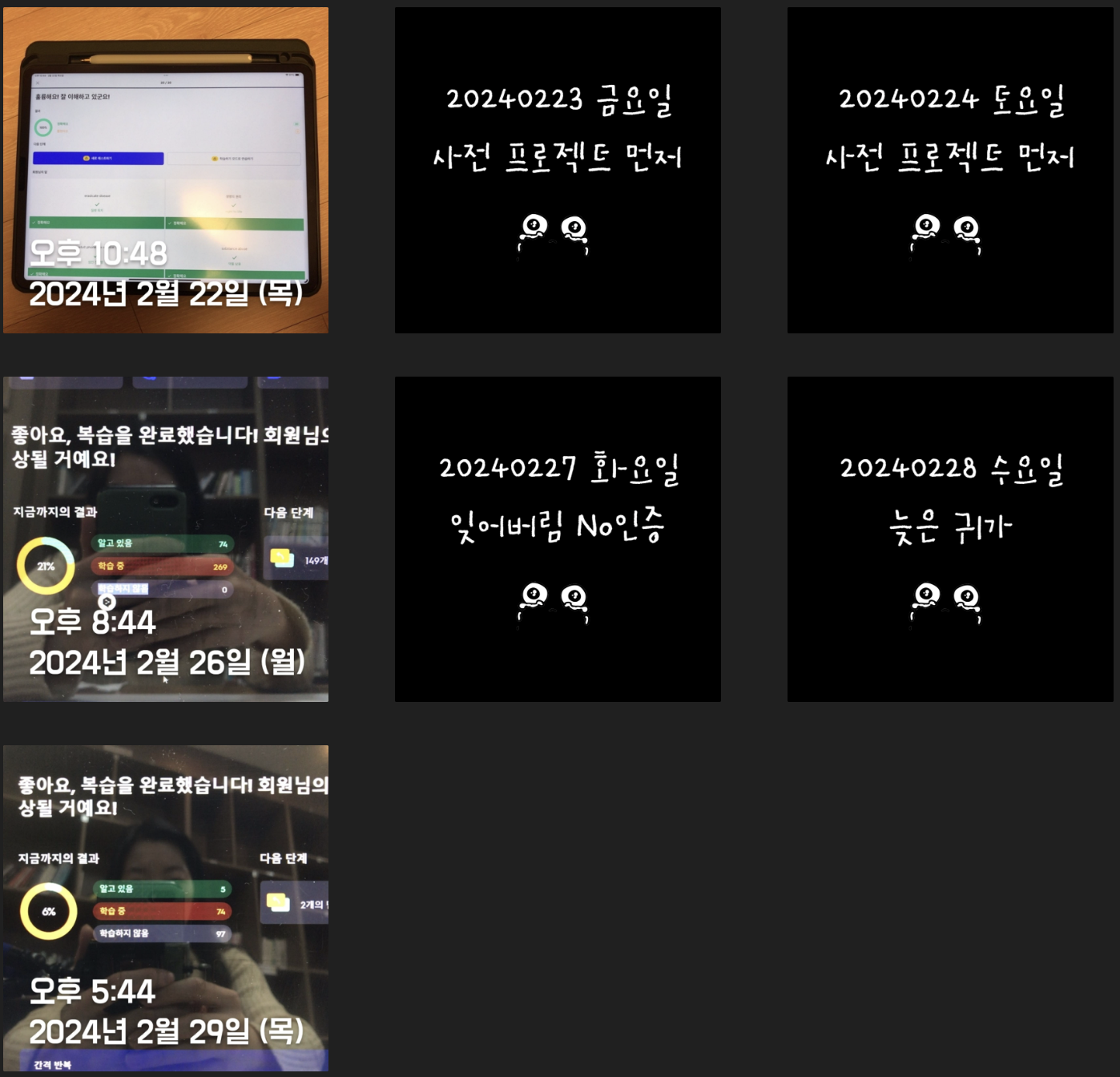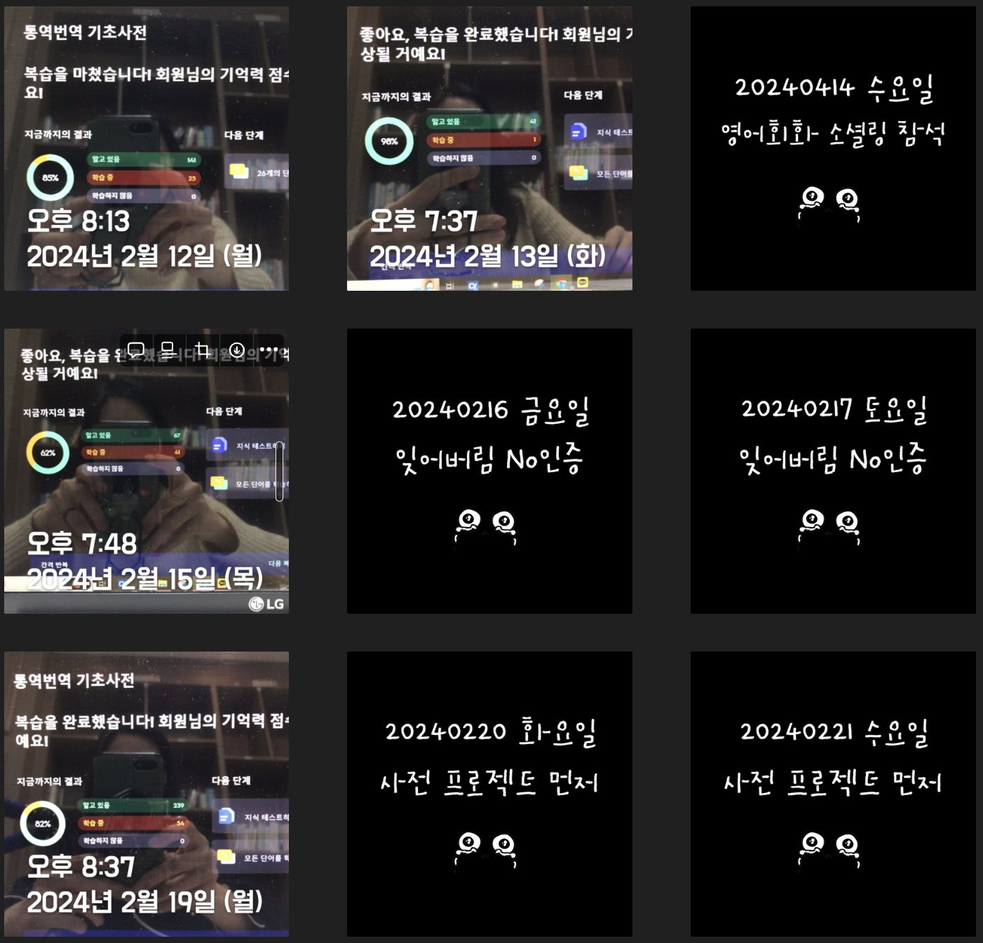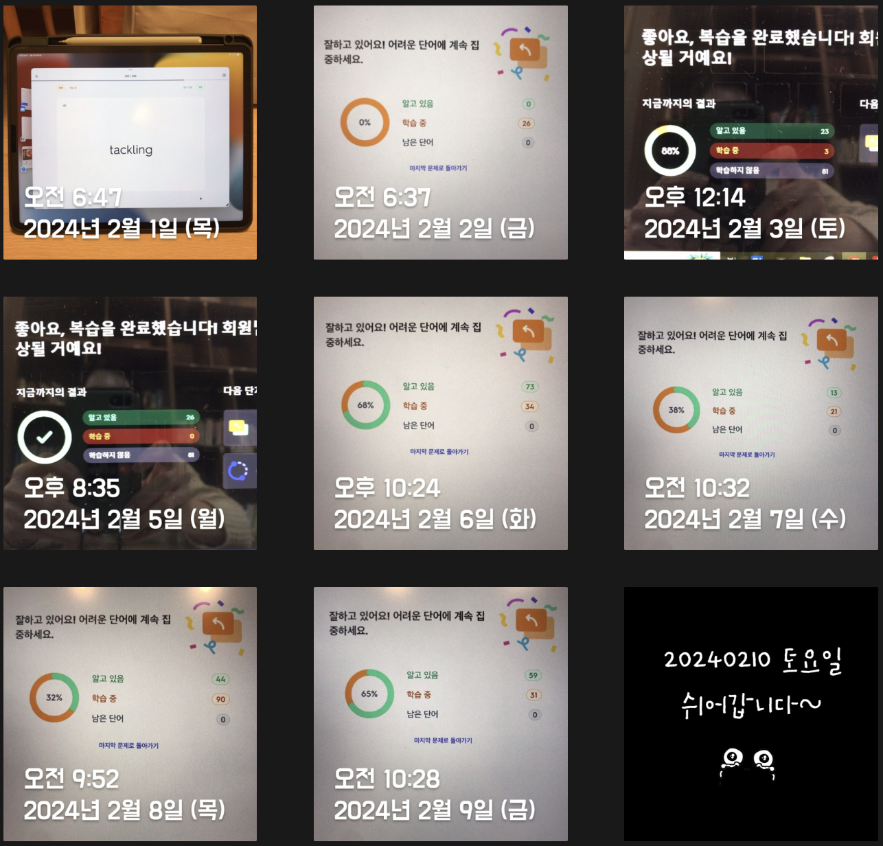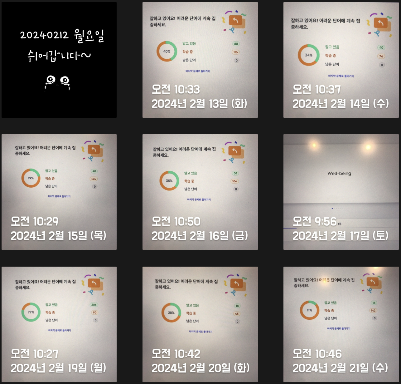 단어복습을 하루에 두 번 하자는 계획이 2월부터 스멀스멀 피어오르기 시작해 Trial을 거치던 시기라 2월은 절반밖에 성공하지 못했다. 하지만 3월엔 많이 나아졌다. 상반기까지는 이런 루틴을 계속 유지해야겠다(외워야 할게 느므 많거든 ㅜㅜ) 조금 아쉽긴 하지만 평일 저녁에 스터디가 있어 의무적으로 빠질 수밖에 없는 날들이 있다. 나의 J 성향에 "쉬어갑니다~"란 인증이 붙으면 너무 거슬리지만 그래도 최대한 정기적으로 루틴을 유지해보려고 노력해보겠다.
