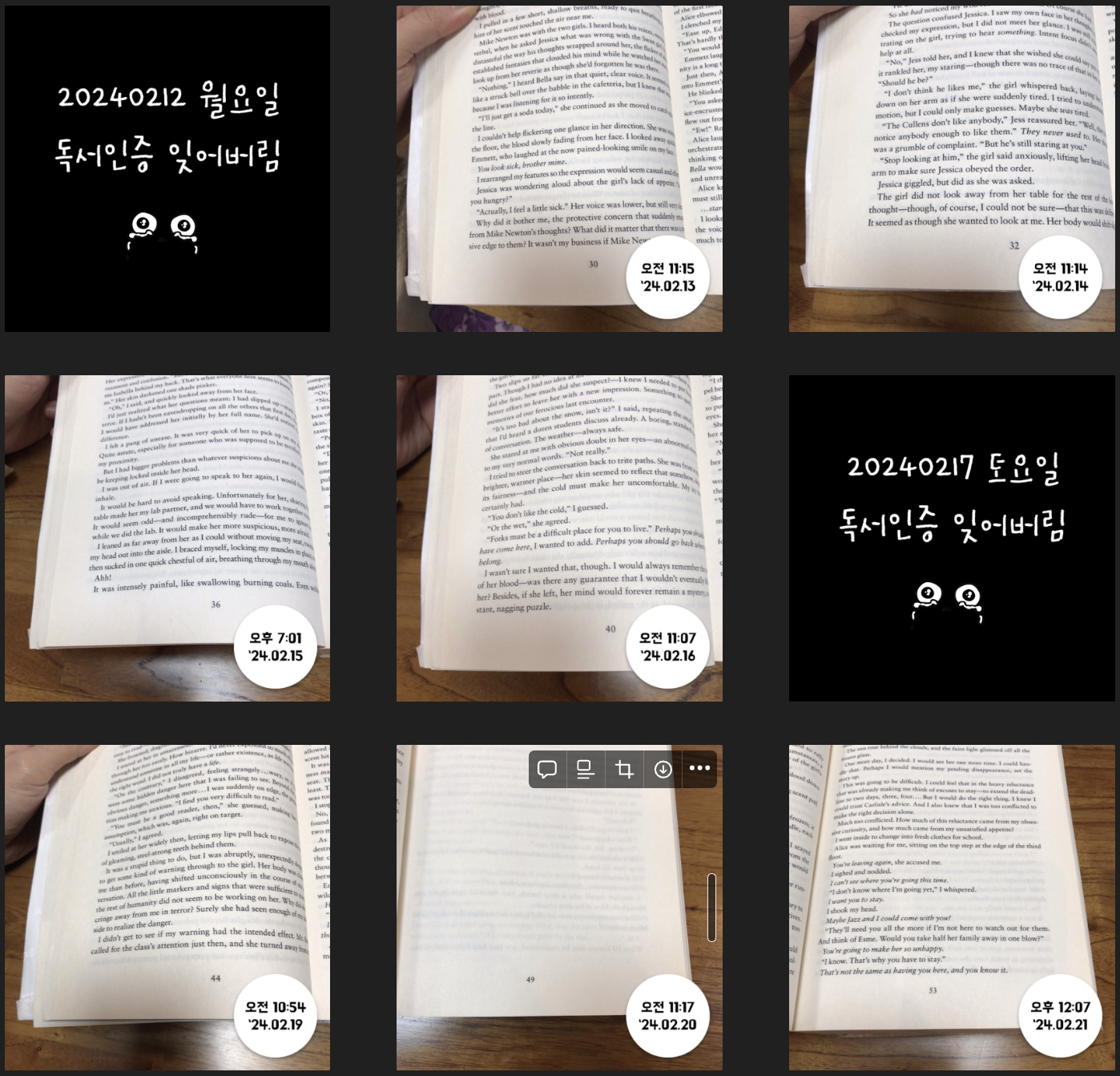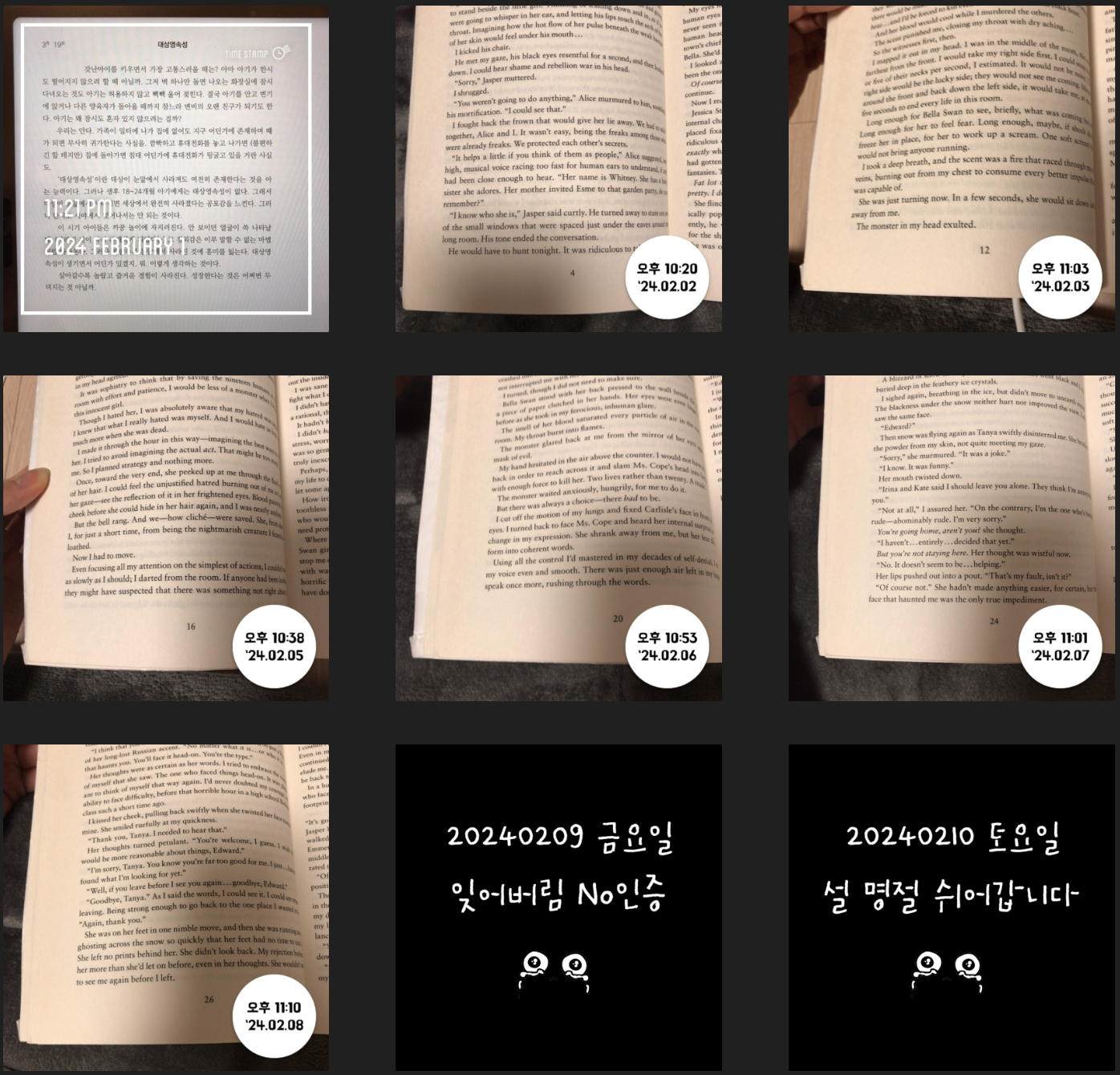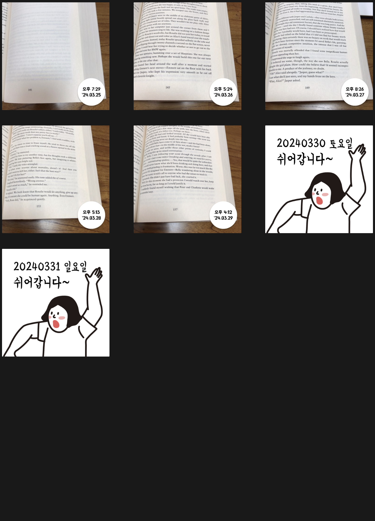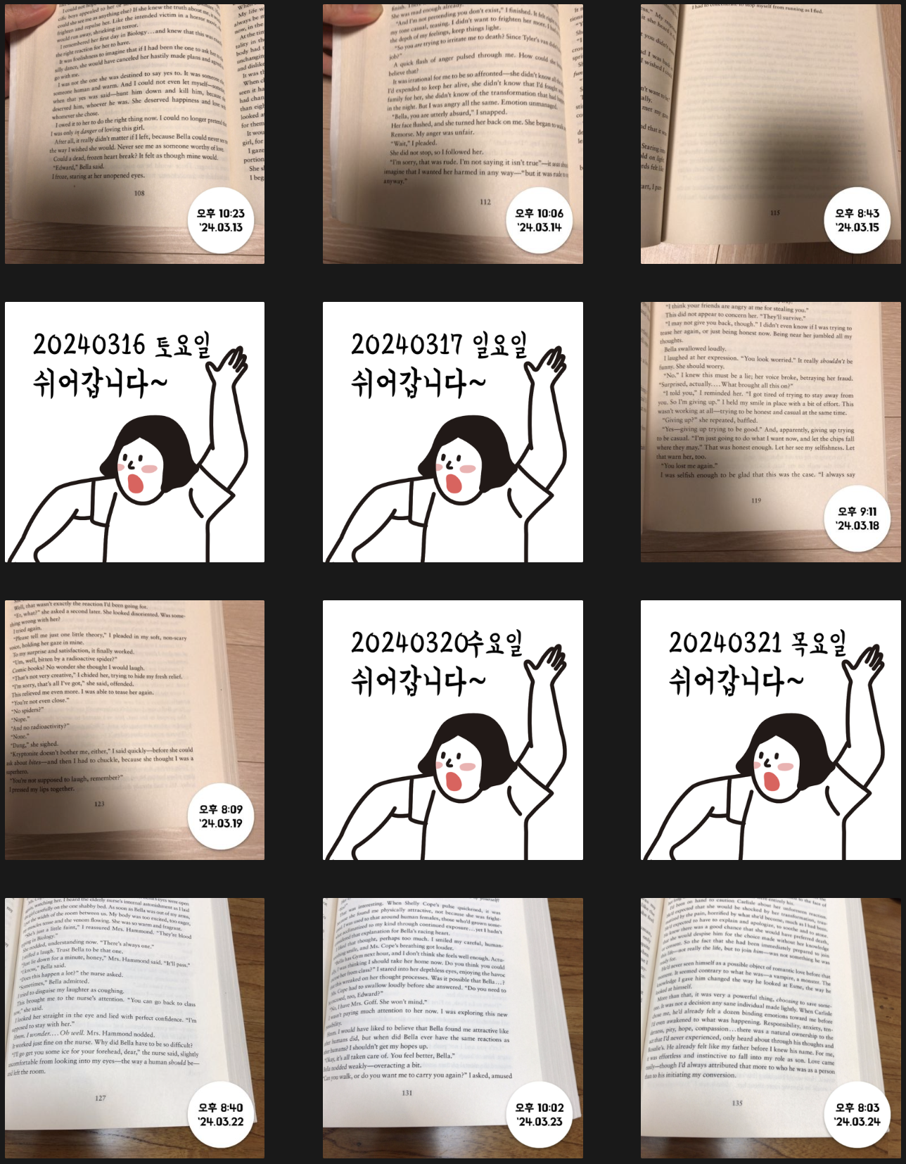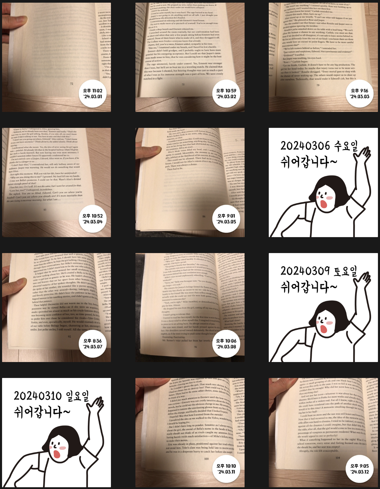 원래는 불면증 때문에 자기 전 핸드폰 보지 말자고 계획했던 것이라 어떤 종이책이든 상관없었다. 그런데 어느 샌가 영어원서로만 읽게 되어서 그냥 이대로 주욱 3월달까지 달려왔다. 하루에 조금씩 읽다보니 귀찮더라도 한 챕터가 끝날 때마다 뿌듯함을 느낀다. 영어원서와는 그닥 친하지 않았는데 영어에 도움이 되리란 기대로 조금씩 하고 있다. 4월에도 계속 해나가기로 하고, 스터디가 있는 저녁을 제외하고는 단어복습과 함께 최대한 루틴을 지키는 것이 목표이다.