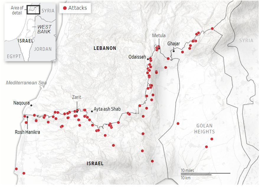 이스라엘 군과 이란의 지원을 받는 레바논 민병대 헤즈볼라는 미국이 지정한 테러 단체로, 가자지구에서 전쟁이 계속되는 동안 이스라엘 진지를 향해 계속 포격을 가하겠다고 공언한 바 있습니다. 이스라엘은 헤즈볼라가 국경에서 병력을 철수하기를 원한다고 말합니다. 이스라엘은 외교를 선호하지만 전쟁에 대비하고 있다고 말합니다.