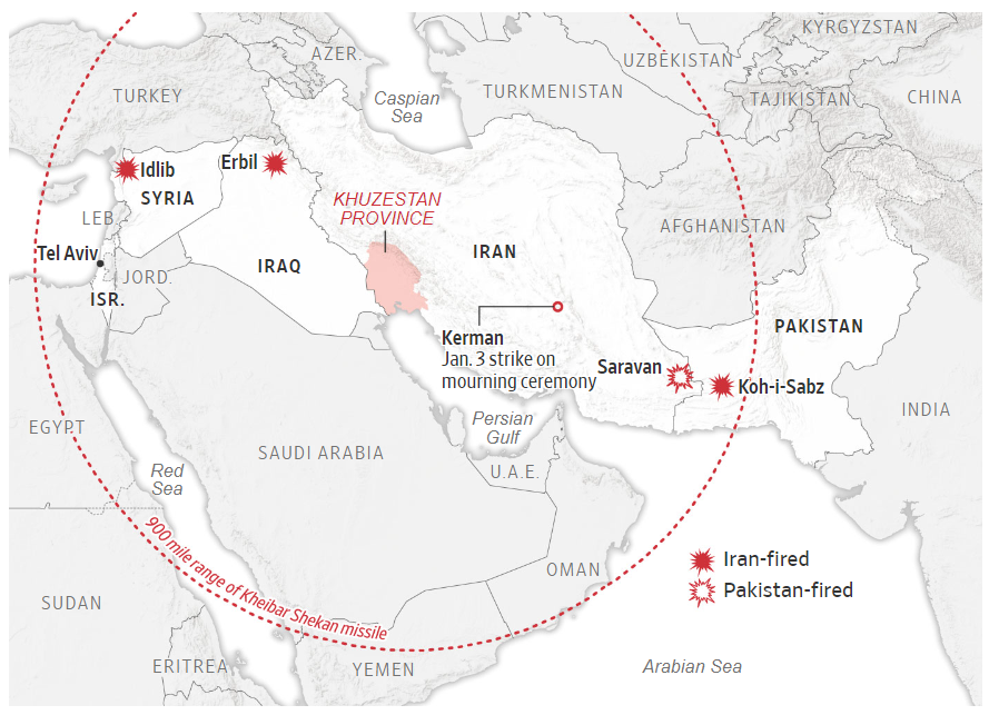2020년 미국의 공습으로 사망한 카셈 솔레이마니 장군을 추모하는 이란의 장례식을 테러 단체 ISIS-K가 공격했습니다. 이후 이란은 시리아, 이라크, 파키스탄의 테러리스트를 겨냥한 장거리 미사일을 발사했습니다. 분석가들은 이란이 전 세계, 특히 미국과 이스라엘에 무기의 능력을 과시하고 있다고 말했습니다. 이에 파키스탄은 이란에 반격했지만 확전을 원하지 않는다고 조심스럽게 말했습니다.